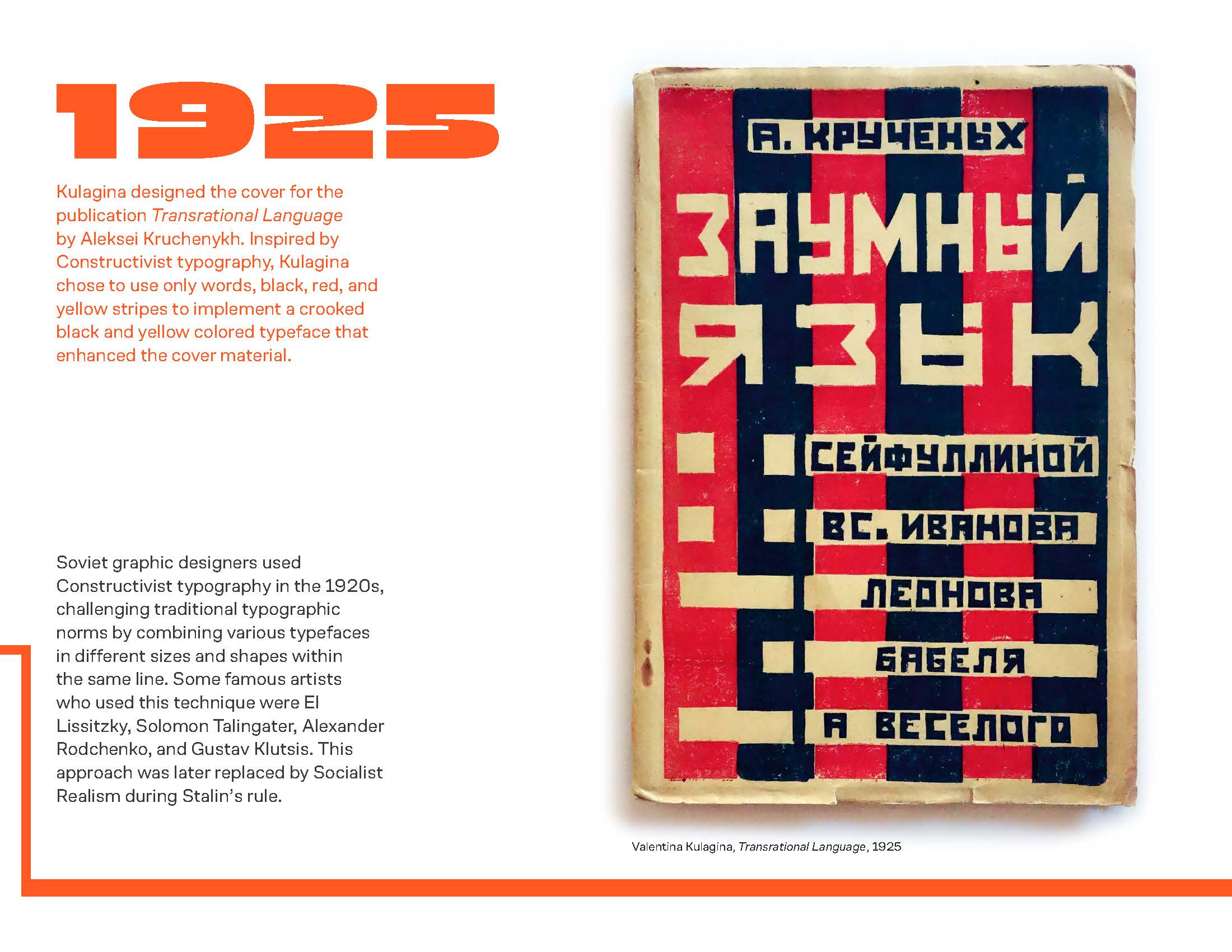 The final booklet features 25 pages covering world history and graphic design from the early 20th century to the present day. When laid out, the book spreads to over 22 feet long. The book features a color coded system: orange colored text covers Valentina Kulagina's life, pink colored text covers Jonathan Barnbrook's life, and grey colored text covers world, art, and graphic design history. The booklet designed using Adobe Indesign. Printed the booklet using PrimeLink Printer on coated paper and assembled using paper tape.
